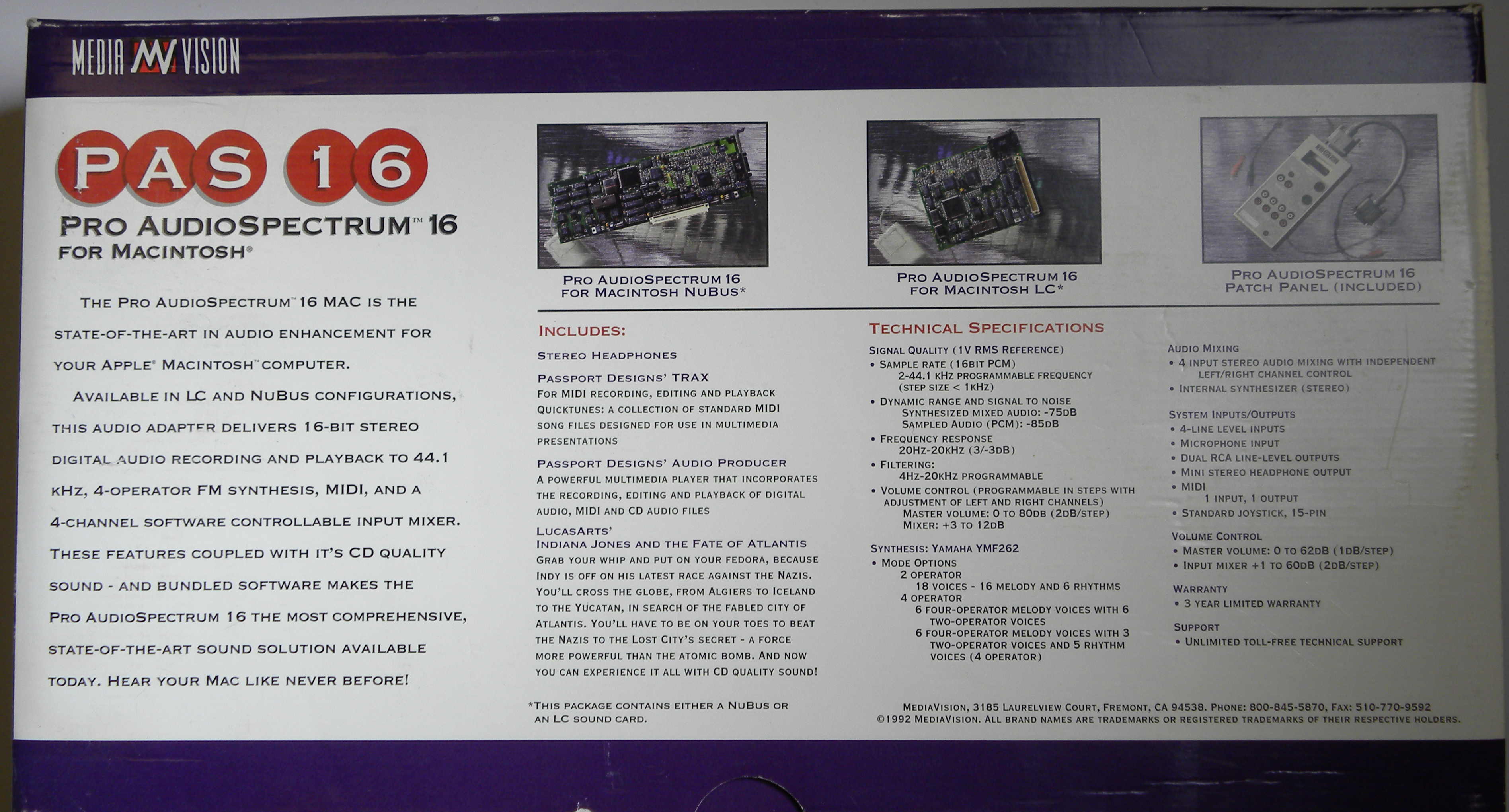 I started out by trying to find old information about the card. Overall, it seems the PAS16 NuBus was basically a fly-by-night product, a stark contrast to the original PC version of the card. Media Vision unceremoniously dumped it out in the market sometime in mid-1993, provided little software support, and by the end of 1994 the company was filing for Chapter 11 bankruptcy protection. Unwanted cards flooded the Mac resale market for years, but a number of people picked them up as an upgrade for their aging 68k-based Macs owing to their comically low price at the time - often as low as $20.