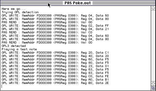 Desperate for some kind of confirmation that I wasn't off the mark, I disassembled the PAS16 extension and despite barely knowing any 68k assembly, I was able to find references to common I/O addresses defined in the development kit for the PC version of the card. However, this investigation also led me down a rabbit hole. I found functions named FM_Bd_Status and FM_Bd_Control and this made me think I could perhaps call into these functions from outside the extension. After wasting a very long time on this, I found they're basically stubs. There were also more direct RdByte and WrtByte functions referenced. I got this idea in my head that they'd be exposed via Device Manager calls and spent a lot of time learning how to interact with the driver that way, but it was completely fruitless due to the lack of documentation. I am pretty sure Media Vision did distribute an SDK for the Mac card, and I remember reading of its existence at once point, but no copy of it has ever turned up.