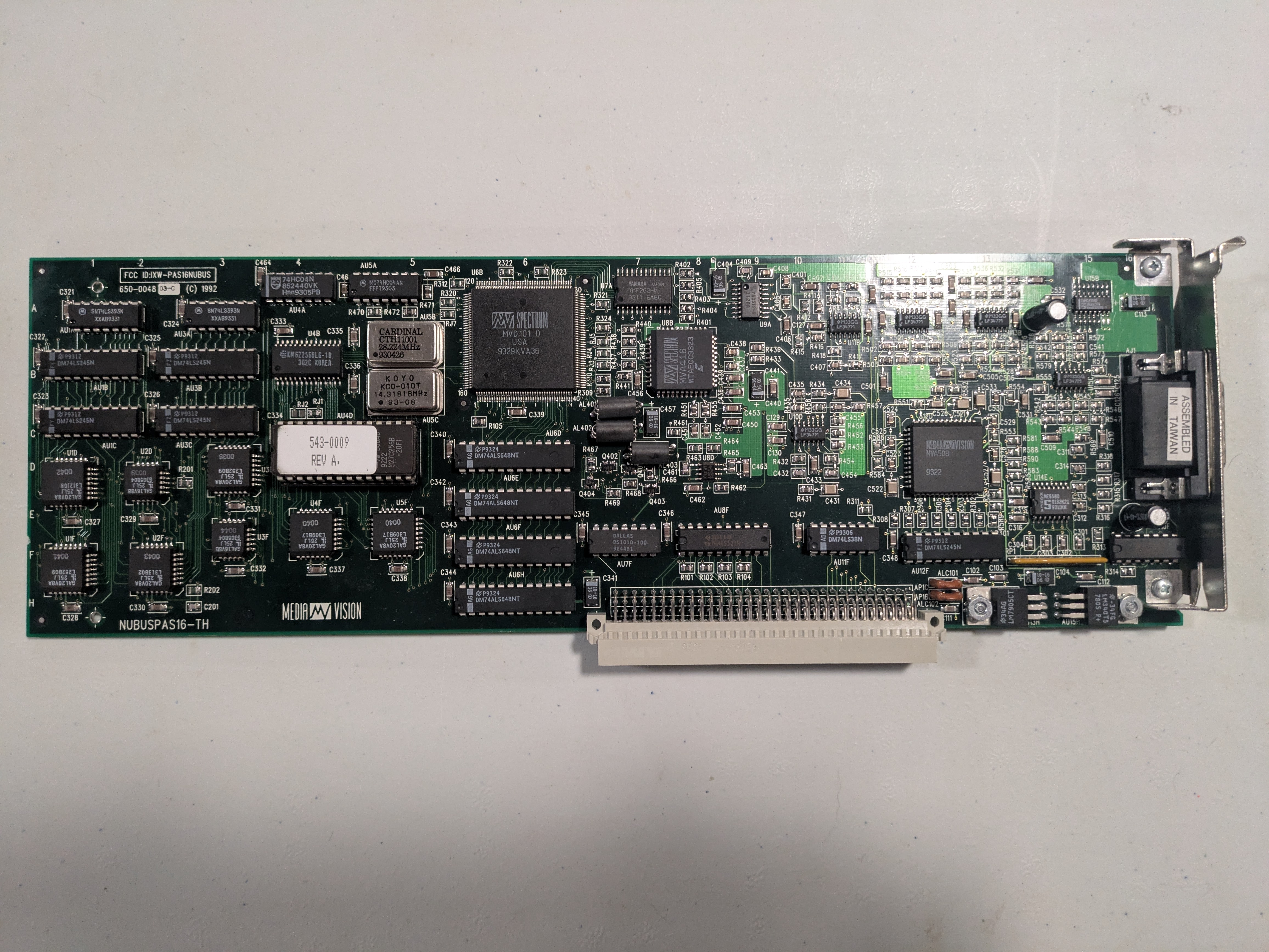 I started out by trying to find old information about the card. Overall, it seems the PAS16 NuBus was basically a fly-by-night product, a stark contrast to the original PC version of the card. Media Vision unceremoniously dumped it out in the market sometime in mid-1993, provided little software support, and by the end of 1994 the company was filing for Chapter 11 bankruptcy protection. Unwanted cards flooded the Mac resale market for years, but a number of people picked them up as an upgrade for their aging 68k-based Macs owing to their comically low price at the time - often as low as $20.